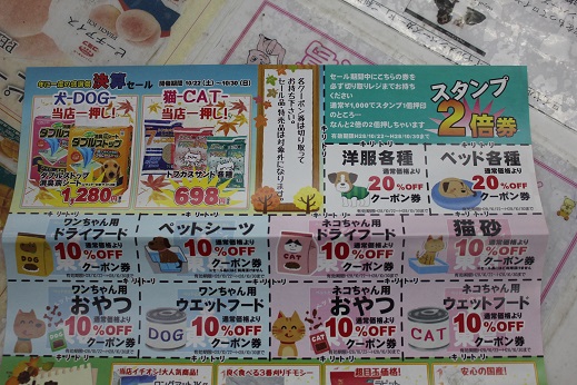 こんにちは、店長です。 本日より始まりました、 「年に一度の感謝際 決算セール」!! 今回は、 お得なクーポンを事前にお配りしているので、 期間中にクーポンをどしどし使ってお得なお買い物をしちゃってください もちろんクーポン以外のお得なセール品もご用意しておりますので、 ぜひご来店ください ワンちゃん・ヌコちゃんも、 今ならいつもよりさらにお迎えしやすくなっております イケメンヌコ代表「天使氏(仮)」も 小売部長氏から “店長による愛しすぎ禁止令”を発令された「ペワワ(仮)」も 皆様のご来店を心よりお待ちしております ~お知らせ~ 只今、当店ではアルバイトを募集しております ・20~35歳の方 ・週3日~働ける方 ・生き物が大好きで、 一緒に楽しいお店作りをしてくれる方 ※未経験者の方でもOKです 募集人数:若干名 詳しくは、店長:長坂まで ご応募お待ちしております