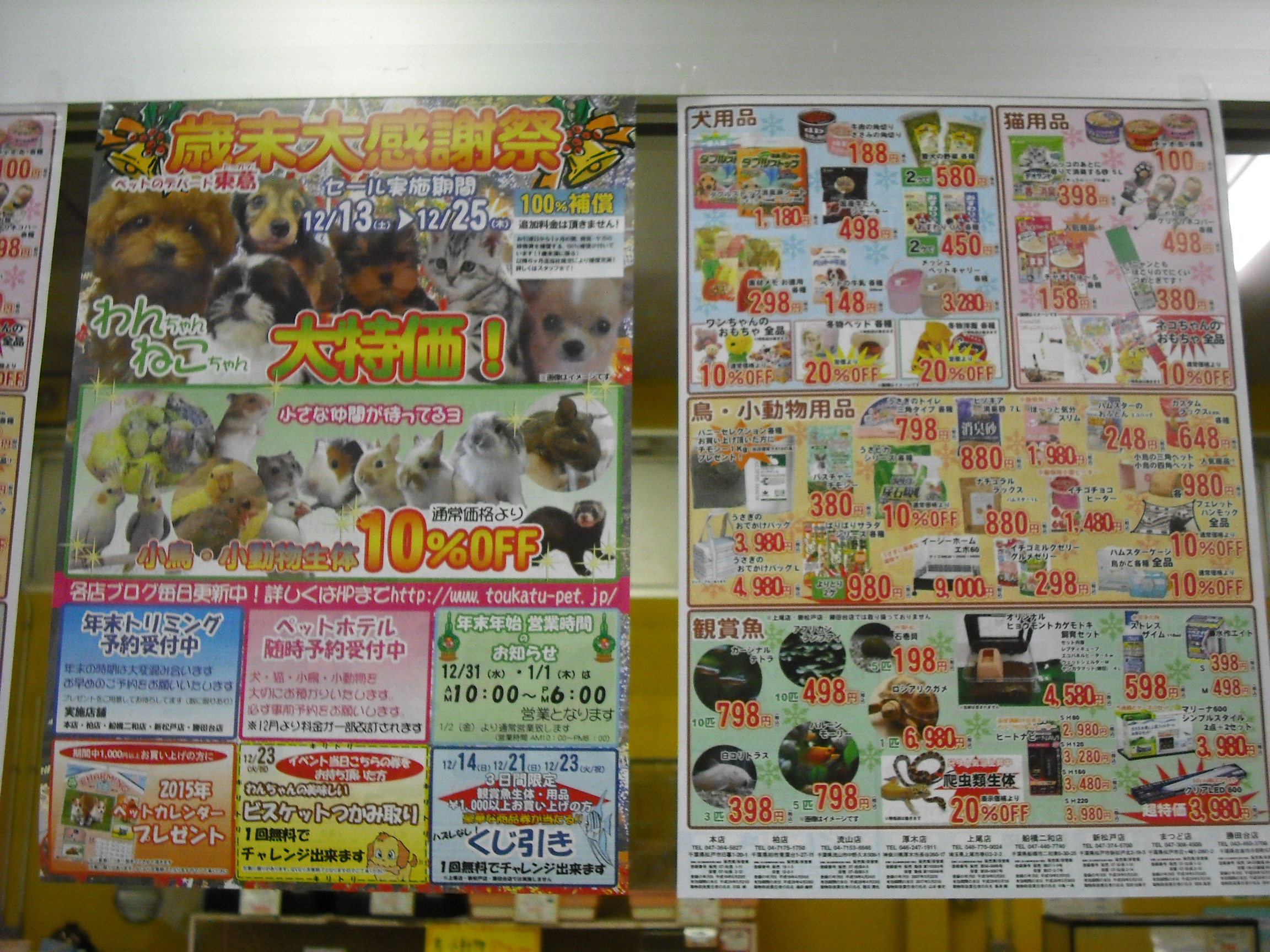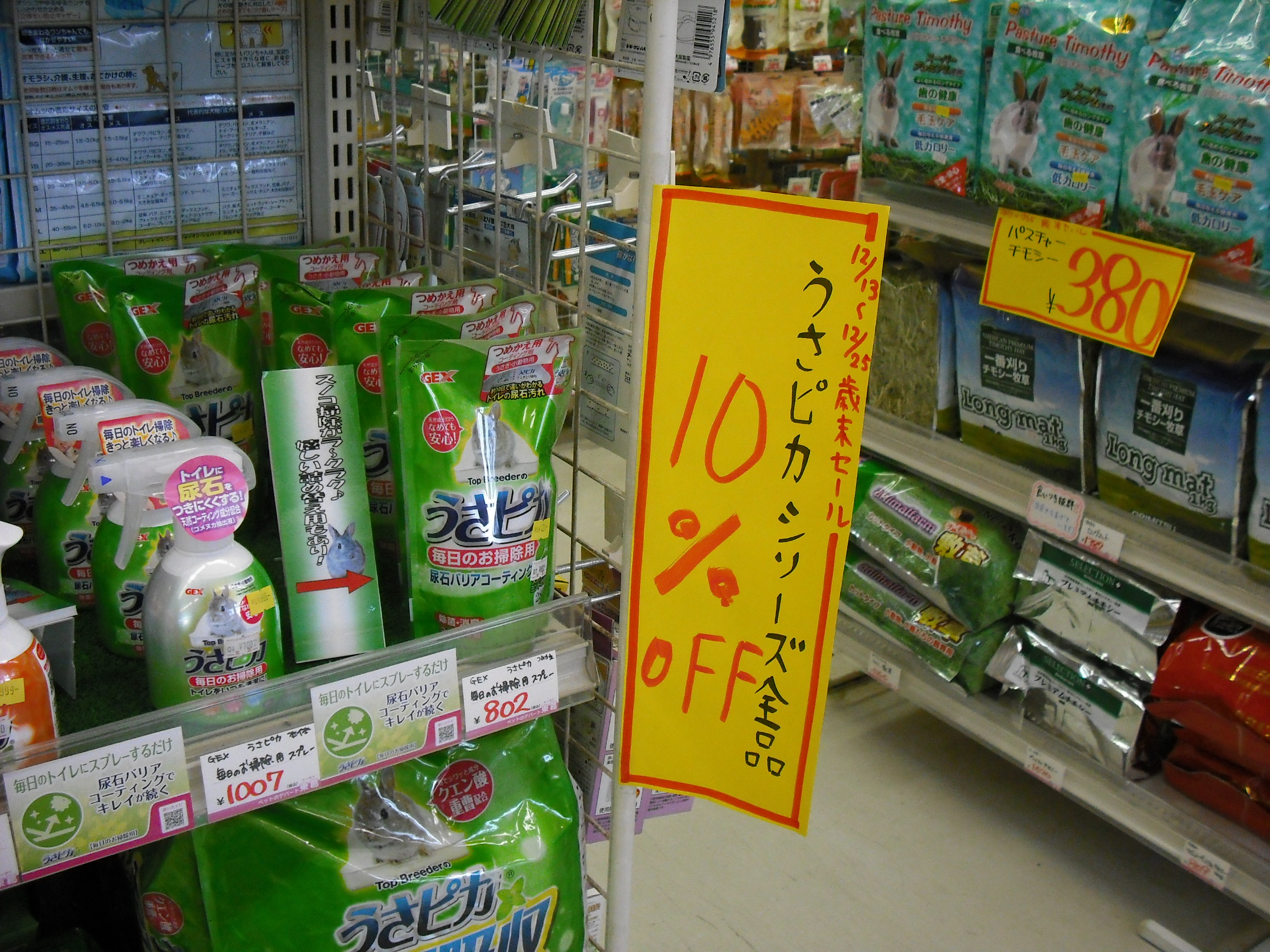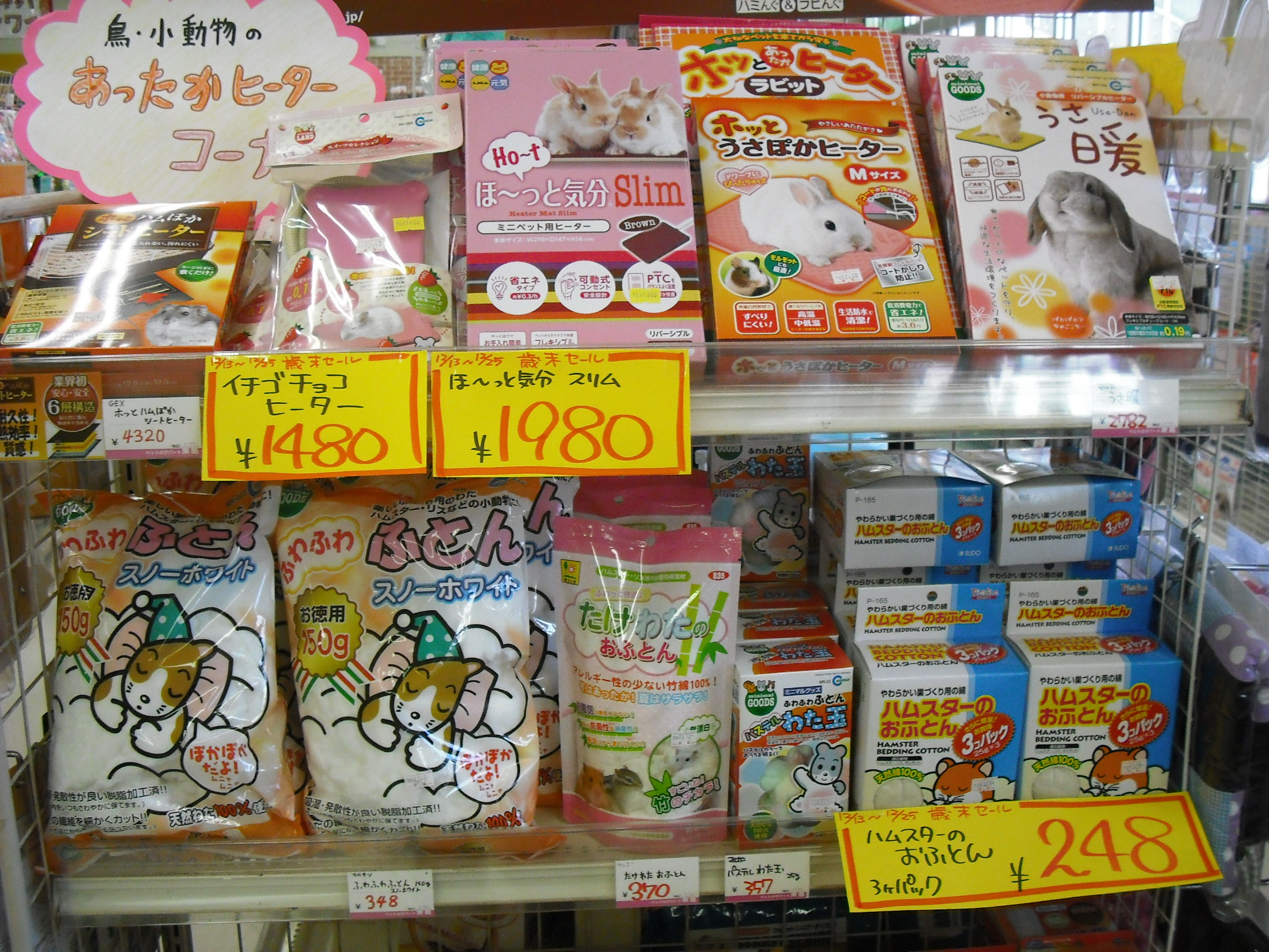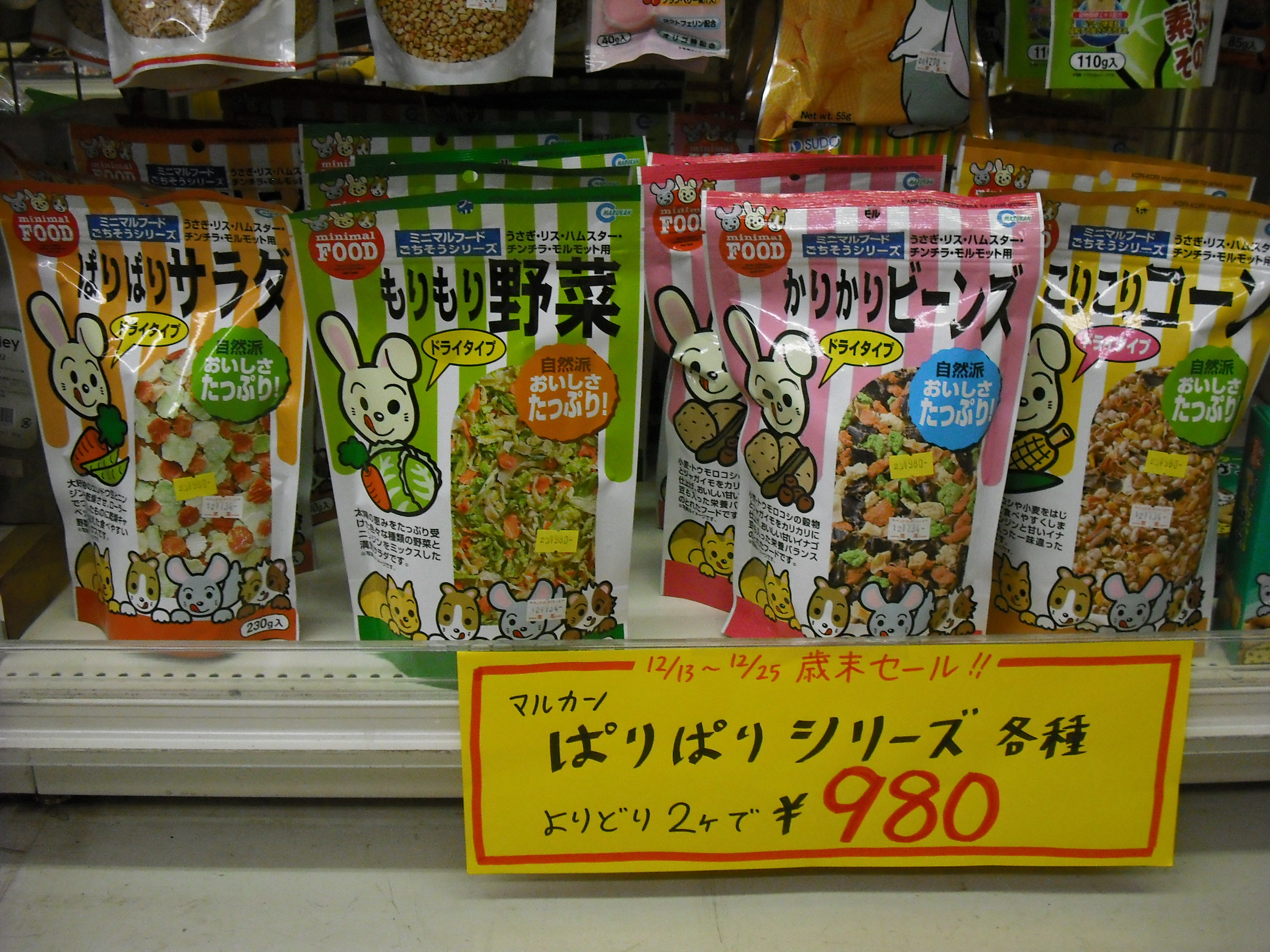 こんばんは、KYOさんです 今年もあと半月ですねぇ なんだかあっという間に過ぎた1年でした 毎年この時期になると始まる歳末セール!! もちろん今年も始まりましたよ 期間は12/13~12/25 おかげさまで流山店はいつにも増して賑やかです♪ 今日は写真多めでセール商品の一部をご紹介 鳥・小動物に~ もちろん犬猫用品も! ちょっと変わったセール品もありますよ それがこちら 普通セール品というのは価格が下がるだけのものが多いですよね? でも、こちらのバニーセレクションシリーズは価格は下がらずにチモシー1kgが付いてきます このチモシーは¥615相当 もしかしたら普通に値下げされるよりお得かもしれませんね これらはほんの一部ですので、まだまだセール商品はありますよ! 用品だけではありません!! 全ての鳥・小動物生体が10%OFF!! 気になる子がいたら、この機会にお迎えしてみてはいかがでしょうか 毎年ご好評いただいている、オリジナルカレンダーを今年もご用意しておりますよ~ この可愛いカレンダーを、1000円以上お買い物されたお客様に差し上げております どっさり用意してありますが、数に限りがあるのでお早めに~ 今年1年の感謝を込めた歳末セールはまだ始まったばかりです! それではまた次回~(・∀・)ノ