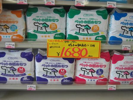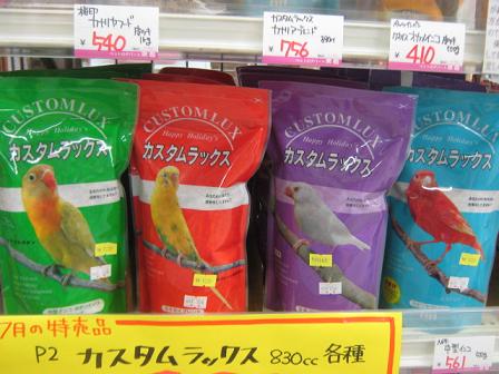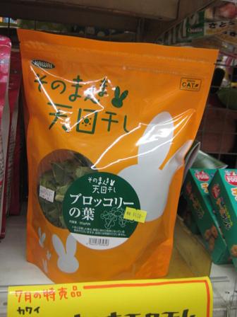 こんにちは松っあんです 早速ですが7月の特売品のご紹介でーす! シーズイシハラ ササミ巻きクッキー 各種 ミルク味、チーズ味、さつまいも味の3種類。 おやつやご褒美にいかがですか? 各¥258 ピュアロイヤル・ドゥロイヤル バラ各種 カリカリフードを食べないわんちゃんでも完食しちゃうウェットフード! 今回はバラ売りでの特売です。 各¥410 トーラス 回転ハブラシ トルトル 毛先がソフトなので歯磨きがニガテなわんちゃんでも安心。 コロコロ転がすだけで汚れが取れちゃう! ¥798 シーズイシハラ ペットの紙おむつ 各種 生理用や介護用に。 下はSSSから上はLサイズまで多数ご用意あります。 特売ではありませんが各サイズお試しパックもありますので ピッタリのサイズを見つけてからお徳用を買うといいかもしれないですね 各¥1680 ドギーマン 小動物の大好きミニコーン とってもかたいのでストレス解消にちょうどいい! 1袋2本入り。 ¥324 サンコー ウッドリター クエン酸プラス クエン酸の殺菌能力でイヤなニオイを抑える! 夏場はニオイが気になるのでオススメです。 ¥1080 カワイ そのまんま天下干し ブロッコリーの葉 ブロッコリーにはBカロチンが多く含まれており 内臓などの膜組織の健康維持をする効果があるみたいです。 ¥460 チモシー敷草 2Kg 小動物以外にも鳥さんのカゴの下にしいても大丈夫。 2Kgたっぷり入ってるのでとってもお得です。 ¥980 カスタムラックス 830cc 各種 それぞれの鳥さんに合わせたエサがブレンドされています。 セキセイ、コザクラ、文鳥、カナリアの4種類。 各¥660 ~お知らせ~ 20日の日曜日にやります! っと外に出て撮っていたら気になる光景が・・・ 毎年恒例の ~アヒルの水浴び始めました~ 鳥小担当のKyoちゃんが愛情を込めて空気を入れたお子様プールに 泳がず立って浸かっている仮名:んがちゃん(←個人的によんでる名前) 水をかけてあげたり楽しそうですよぉ~。。。kyoちゃんが!笑 脱線しましたが20日のおやつ試食会ですが ペッツルートさんのご協力いただいて たくさんおやつ入手しました。 来られた方全員に無料でお配りしますのでお楽しみに 最後に、他の店舗から大きいコがやってきました! 久しぶりっ!KABUKIさん 只今ぬるま湯にて浸り中 ちょっと狭そうですがご満悦? そんなMr.KABUKIがなんと驚きのお値段 ぜひ遊びに来てねー