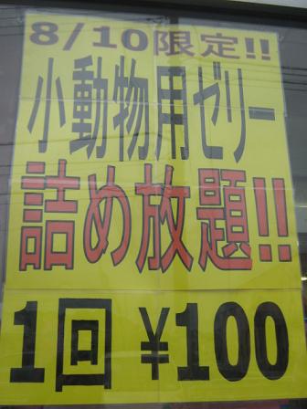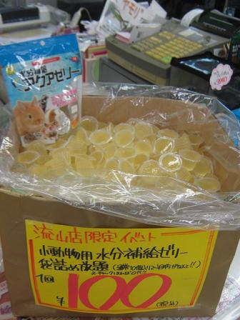 こんにちは松っあんです 今日は涼しいですねぇ~ 冷房の部屋にいると逆に寒いぐらいに感じます。 でもこのぐらいの温度が続けば夏、大好きなのになぁ~ 時間がないので前置きはこの辺にして8月の特売品のご紹介 アイムス 2Kg 各種 この暑い時期は大袋より小袋フードの方がオススメですよ! タダでさえ安いのにもっと安く!買い溜めしましょー 各¥1280 猫砂 ブルーノ 流山店で一番売れている猫砂です。 分かりやすくした所だけ青くなるのでそこだけ取って捨てるだけ! ニオイも気にならないのでオススメです! ¥598 サンコー ドワーフボール ボールの中にハムちゃんをいれてお家の中をゴロゴロ~ あまり激しく転がすと目が回るのでほどほどに。 ¥498 サンコー ランナーボール こちらはゴールデン用。 大きめボールなのでハリネズミやデグーもギリギリいけます! ¥880 クオリスシリーズ 各種 各鳥さんごとに配合されている総合栄養食です。 こちらもよく売れています! ¥350 クオリス オーツ麦 低脂肪のオーツ麦なのでちょっと太り気味な 鳥さん、ウサギさんやハムちゃんにも与えられます。 ¥250 今日はここまで。 次は、他の店舗からやってきました! チンチラのシルバー男の子です。(H26.5.12生) 真っ白でフワフワなイケメン目もほんのり緑色してます。 性格はとってもヤンチャみたいです。 少し遊んであげただけで歯型たっぷり でも本気で噛んだりしないのでお子様がいるお家でもオススメです! 気になるお値段はお店にて 最後にお知らせでーす! 明日10日(日)ポイント2倍の日に流山店限定で やります 水分補給ゼリーなのでこの暑い夏にピッタリだと思います! たっぷりあるのでちぎれるギリギリまで詰めてってください ちなみに、店長が全力で詰めてこんな感じに。 これで11個入ってます。 元の1袋には10個入ってるのでかなりおとく、オトク、OTOKUですよぉ~ 台風が近付いているみたいですが明日はぜひ流山店に遊びにきてください