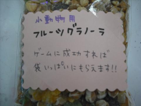 こんにちは、バイトのMです。 お店の照明が蛍光灯からLEDになりました。 前より青白い感じの光になり、若干顔色が悪く見えそうで心配です。 店の中は明るくなりまして、床がキレイに見えたりしています。 眩しさには、その内慣れるものでしょうか…? それはそうと、明日は20日! ポイント2倍の日ですね! 流山店では小動物向けのイベントを開催します! じゃん! 突如レジ横に用意されたビンに、大量の・・・これ何て言うんですかね? シリアル?みたいな? とにかく、乾燥フルーツやら穀物やらが入ってます。 美味しかったです(スタッフは味見済み) これ、実は人間用ではなく、小動物用のおやつ。 明日、お店で買い物をして、ゲームに成功すると、写真のように袋いっぱい貰えちゃいます。 そのゲームというのが。。。 例の・・・あれです。 こんな感じです。 失敗しちゃっても、スプーン1杯分は貰えますので、是非チャレンジしてみて下さい。 ところで…前回紹介した、ざわ〇ん君… お店に入って、すぐ。正面にデビューしました。 黄色の四角がケージ。赤い丸がざ〇ちん君。 かなり大きなケージです。 普段はのんびりと寛いでいるざわ〇ん君ですが、興奮すると噛んで遊び始めてしまいます。 特に、お子様連れのお客様は、お気をつけ下さい。 触りたいときは、スタッフに声をかけて頂ければケージから出します。 お気軽にお申し付け下さい(^▽^) 明日は流山店にGOですよ~(`・▽・´)ノシ ☆拍手返信☆ てんちゃんママさま 動物は基本的にカメラが苦手なコが、多いみたいです。 レンズと目が合うのが怖いんだと思います。 店のコの写真も、何度と無くそっぽ向かれながら根気よく撮影した成果です(笑) カメラが怖いものではないと分かれば、ばっちり撮らせてくれるようになると思いますよ(^v^)b