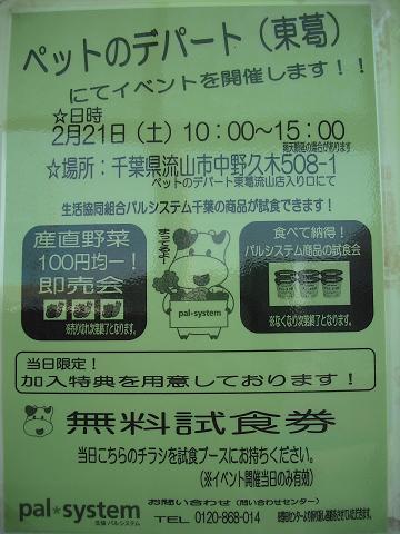 こんにちは松っあんです いきなりですが今日のポポ氏。 大特価10円ヤッタネ なぁ~んて書くと上の方々に怒られてしまうのでこれはフィクションです。 先日勝田台店の方から兄弟お揃いの手作りネクタイを頂きましたが お転婆すぎてご覧の通りダラーンとだらしのない事に。。。 一応女の子なんだからもうちょっとおしゃれに気を遣ってほしいです。 これじゃ、酔っ払いのサラリーマン状態 勝田台のゴーちゃんはとってもおりこうさんみたいですね。 ポポさんもおすわり、まて、よしいくぞう!ぐらいしか出来ません。 今お手、おかわりの練習中ですがどうも集中力が。。。 コツとかあったら教えていただきたいです!(切実) はい。今日はお悩み相談ではなくイベントのお知らせだった 2月21日(土)に流山店にて限定イベント 生活協同組合パルシステムさんと一日限りのコラボレーション! パルシステムさんの方で ★産地野菜100円均一!即売会 ★ヨーグルト試食会 野菜100円均一はかなりお得じゃないかと! 今お野菜高いですからねぇ~・・・ 松っあんも参戦して買占めたいと思います! 時間は10:00~15:00までとなっております お楽しみに~ 最後に かわいいうさぎさんたち来ました このあと店長がかめあり女子力パワー全開でご紹介します! こうご期待