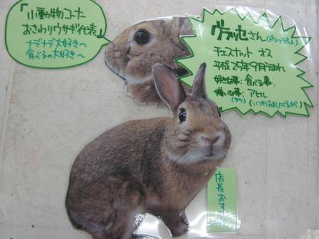 こんにちは松っあんです 来月小学校の時のクラスの同窓会をやることになりました! 土曜日からLINEのグループでのトークが鳴り止まないぐらい盛り上がってます。 わたしは仕事なので参加できるかわかりませんがワクワクです わたしが通っていた小学校は全学年1クラスしかない極小小学校だったので 約40名のクラスのみんなが仲良くて兄弟みたいな感じです。 今回は引越しちゃった友達もたくさん来るので 仕事頑張って終わらせて少しでも顔出せたらいいなぁ~っと思ってます! では特売品のご紹介、本日最終回です! マナーのためのお手入れタオル 本体・詰め替え トイレやお散歩の後にササっと拭くだけ。 たっぷり300枚入ってる超オトクサイズ! 本体¥1100 詰め替え¥888 シニア犬の食事 各種 シニア犬用にグルコサミン・DHAが入ってます。 ササミベースに右からさつまいも、野菜、軟骨の3種類です。 各¥118 デビフ缶 各種 食欲ないわんちゃんにちょっと混ぜてあげると喜んで食べます。 オススメは豚チーズと鶏肉のスープ煮です! 各¥118 天然消臭トイレ砂 活性炭でできたウサギ用トイレ砂です。 吸水力もバツグン! ¥888 ペパーレミックス 小動物や鳥さんの敷き床に。 ¥880 バニーセレクション 各種 ウサギの健康を考えた総合栄養フードです。 年齢別やロップイヤー専用もあります。 各¥1780 リンゴのしなやか果実 リンゴをフリーズドライにした小動物用のおやつです。 他にもイチゴ、モモ味があります。 各¥350 ラビットハウスST 初めてウサギを飼う方にオススメ。 カゴ部分と底が簡単にはずせるのでお掃除もラクラクです。 ¥4320 イジョウデス。 先日ブログで紹介しました。 スタッフおすすめボード。 だいぶ賑やかになってきました。 そしてついに卒業生が 店長オススメ:おさわりウサギ代表「グラッセさん」 お家が決まりましたぁ 1歳になる前にお家が決まってよかったです! きっと幸せに暮らしていることでしょー そして次に選ばれたおさわり代表は 松っあんオススメの「ホタテ氏」 性格・・・・・・最高に良し! このカメラ目線、お気に入りです ぜひおさわりに来てくださーい! それでは さよーならー