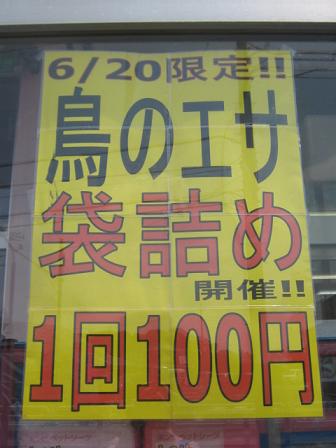 こんにちは松っあんです 最近淡水で飼えるフグ、「アベニーパファー」を飼い始めました。 ぷかぁ~っと泳ぐ姿や水草の中で寝る仕草に毎日癒されています。 結構馴れるもんですね。飼い始めて2~3日でピンセットからゴハンを食べてくれました 今月はフグにお金をかけてしまったのでお財布の中がピンチです。タスケテクダサイ・・・ それでは、6月の特売品の紹介ラストです! スドー 木製ブランコ 小¥248 大¥298 ペッツルート かつおけずり各種 ¥320 ペッツルート とりけずり各種 ¥320 マルカン 小動物の野菜シリーズ 各種¥548 以上です。ここからは流山店限定特売品のご紹介! シーズイシハラ エコエコ ¥537 たくさん入ってこのお値段!環境にもお財布にも優しいですね。 在庫もたっぷりあるので箱買いもできちゃいますよ! マルカン キティケージ 猫用の2階建てケージとしても使え、 1段だと小動物のチンチラさんも飼えちゃいます! 通常だと¥10,800ですが特別価格!¥6,980とお買い得 これを機会に新しいケージにしてみては? 最後にお知らせ! 明日20日は東葛ペット全店ポイント2倍の日! なので流山店限定でまたまたイベントやっちゃいます 鳥さん飼っている方、お待たせいたしました! だそうです ひえ、あわ、きび、ヒマワリの種の4種類をお好きにブレンドして頂きます! 試しに詰めると(ヒマワリの種なし) 結構イケマスよ ドケチな私がもし文鳥を1羽飼ったら1ヶ月は余裕でもつでしょう 1回100円、お一人様2回までなのでいかがですか? 次回予告! 新入りのダックスの赤ちゃんがやってきました! ダックス担当のMさんが紹介してくれるとおもうのでお楽しみに