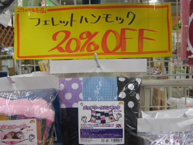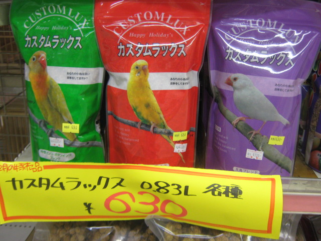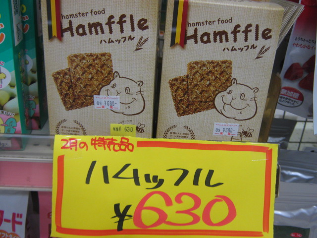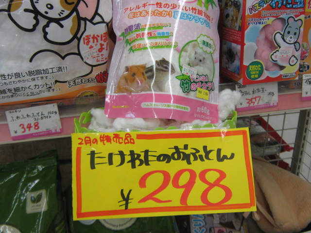 こんばんは! バイトのM・・・だと思った? 残念!ラットの『ルカ(仮)』だよ!`・ω・ノシ 女の子だよ! 今日はボクが、鳥と小動物のお得な商品をお届けしちゃうよ! まずは『たけわたのおふとん』 竹で出来たおふとんだよ。 消臭効果が高くて、夏はサラサラ、冬はほかほか!万能だね! ボクみたいな小さい足にも絡まりにくい、短めカットだから安心! 竹には抗菌作用もあるんだって! 鳥小担当『きょーちゃん』が触れるように準備してたから、お店で見掛けたら触ってみて! ハムスターのご飯『ハムッフル』 おやつのワッフルみたいだけど、ちゃんと栄養の取れるごはんだよ! 大きな塊を8分の1くらいに、割ってからハムちゃんにあげてね。 2枚入ってるから、大体2週間ちょっとくらいで食べ終わるかなぁ。 はちみつふりかけも入ってて、すごく美味しそう! ボクも食べたいなー。 みんな大好き『なつめ』 人間の漢方にも使われるなつめ。 ストレスを抑えてくれる効果があるんだって! おうちのお掃除した時とか、病院に行った後とか、もちろん普段のおやつにも! 目安は、うさぎさんで一日一粒。一袋に10粒入ってるから、ゆっくり食べてね! 小鳥さんのごはん『カスタムラックス』 中型インコ・セキセイインコ・文鳥用の3種類があるよ。 ボクのオススメはお店でミックスしてる880円の鳥フードだけど、家庭に優しい値段だね´・ω・ 寒い時期には、『ちんぴ』もオススメ! 浮いたお金でおやつも買って、鳥さんが元気に冬を乗り切れると良いね! 『ちんぴ』が何だかわからない人は、お店でスタッフに聞いてね(>ω・)b 最後は『フェレット用ハンモック』 汚れちゃったハンモックは洗って使えるけど、フェレさんはハンモック壊すのも大好きだよね・・・ ボロボロのハンモックを新しくするなら、今がチャンス!!>口< ボクもハンモックがあったら中で包まって寝たいなぁ・・・木のおうちも好きだよ。 他にもお徳な商品がいっぱい! 爬虫類コーナーにはMの好きなかわいいトカゲも新しく来たんだって! ボクの方がかわいいに決まってるのにね!(`ω´*)プンスコ 特売品は今月いっぱいまで! 2月は短いから早めに来てね!(`・ω・´)ノシ