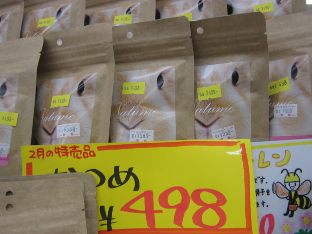 こんにちは松っあんです 火曜日は雪、思ったより降らなかったですね 通勤は大変だけど家で眺めてるのは好きなんですよねぇ~ そして雪山に行ってスキーしたいです さて、今日は2月の特売にゃんこの巻です! ネコ砂『ブルーノ 7L』 汚れた部分だけ青くなるので そこだけ取って燃えるゴミにポイチャするだけ! 当店ネコ砂部門1位です ¥598 いなば『金のだしカップ 各種』 カップのままあげるのも良し・・・ お皿に移してあげるも良し・・・ 普通の缶詰よりあげやすく捨てるのもプラゴミにポイチャするだけ! いろーんな味があるのでこれを気に全種類制覇してみては? 各種よりどり¥380 ペッツルート『無添加 減塩かつおけずり 各種』 お魚の血合が抜かれてるのでとっても低脂肪、旨みたっぷり! ダイエット中のネコちゃんでもガッツリいけます! ネコちゃんだけでなくわんちゃんも食べれるみたいです。 各種¥315 そして2月といえば・・・ そう!ネコの月 すてきなネココーナーが設けられました! ネコちゃんにはかかせない ・ねこじゃらし ・食べられるネコ草 ・つめとぎ などなどたくさんのネコグッズをそろえてみました レジ前に大きく展開しております。 Mさんのかわいい絵心あるポップが目印 さすが先輩!尊敬します 最後に・・・ 今日の松っあんの湯たんぽ チワワの「くら」。 H25年6月生まれ、男の子。 性格が優しすぎるせいかケンカが弱い「イケテナイワンコ」笑 どうか暖かく見守ってやってください