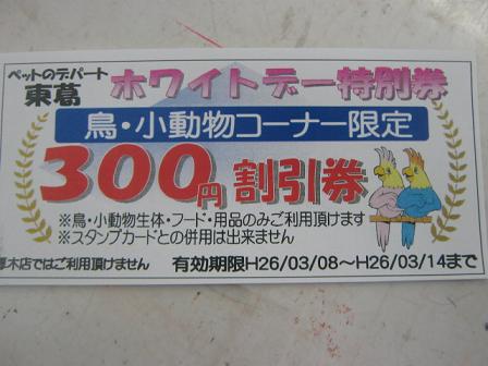 こんにちは松っあんです 朝からミーヤキャットの『信長』に噛まれてテンション下がりぎみです ですが、今日は東葛ペット『ポイント2倍』の日 気合でのりきりたいと思います さて、題名にも書きましたが 実は2/8から『バレンタインイベント』を行なっております。 14日までの期間中に¥1,000以上お買い上げ頂くと こちら 『300円割引券』をお配りしておりまして 3/8~14まで鳥・小動物生体・用品などでご利用頂けます。 枚数に限りがございますのでお早めにっ! そして、以前にも紹介しました カラーハムスターの赤ちゃん こんなに大きく成長しました 今ではお父さん、お母さんに負けないぐらい食いしん坊です。 ホラおめめクリクリでしょ 5匹いますがみーーんな同じ顔、模様なので見分けが難しいです。 性格もご両親に似てとっても穏やか。 うで乗りできますよ! すぐにお持ち帰りもできる状態なのでいかがですか? ちなみに1匹すでに売約済です。 最後に、今日の松っあんの癒し係り・・・ 鼻デカダックス仮名:『エルメス』(H25.3.14生) ブサカワだよ 本当はもっとかわいい顔なんですがね・・・ 性格も優しくて甘えん坊です なのに・・・ カメラの前だとコンナカオ。。。 ま、そこも含めてかわいいですね 拍手コメント頂きました! ロンハチママさん コメントありがとうございます! オカメちゃん、どうやらノーマルみたいです ゴハンをねだるしぐさって可愛いですよね またお家の鳥さんと一緒に遊びに来てくださいね