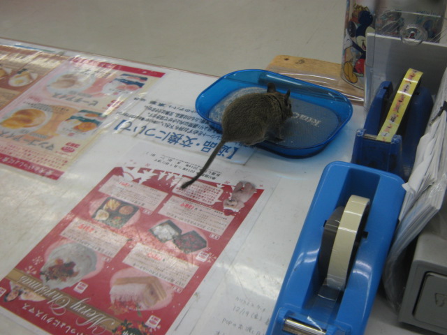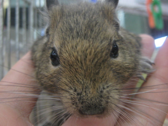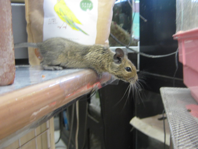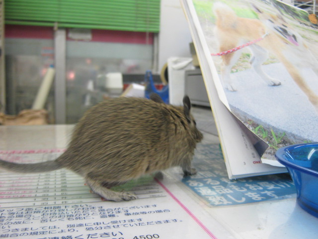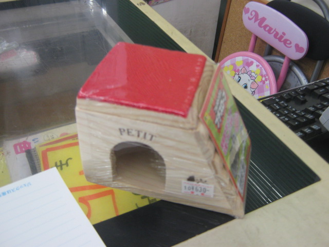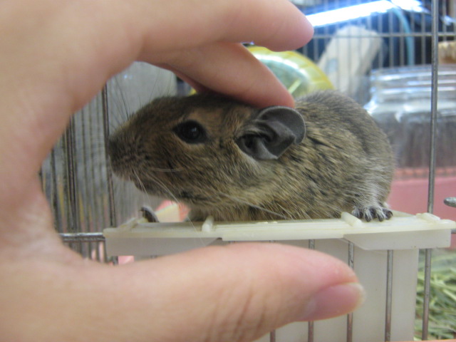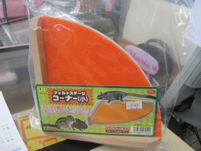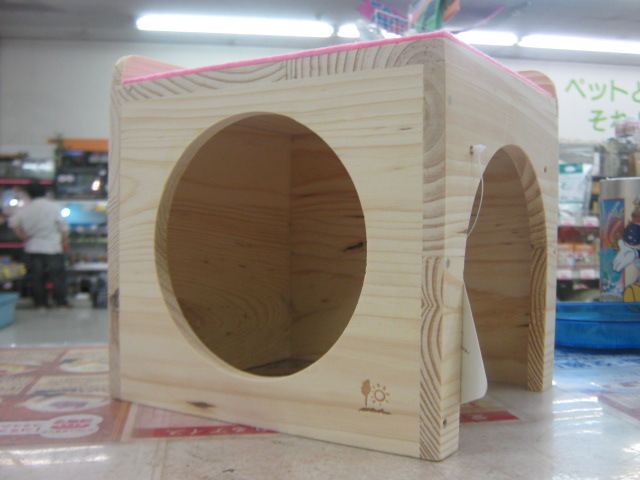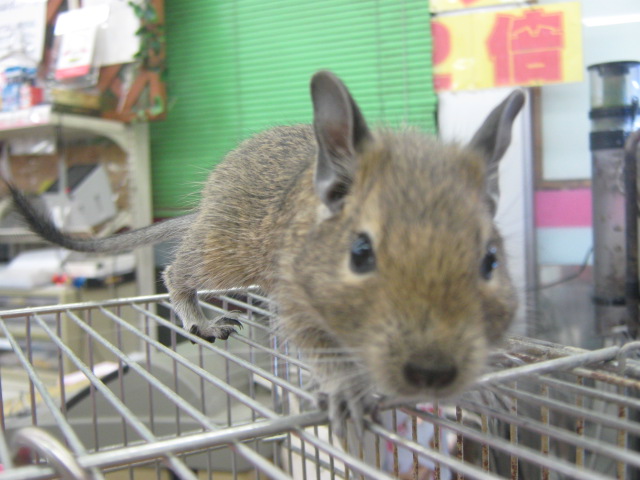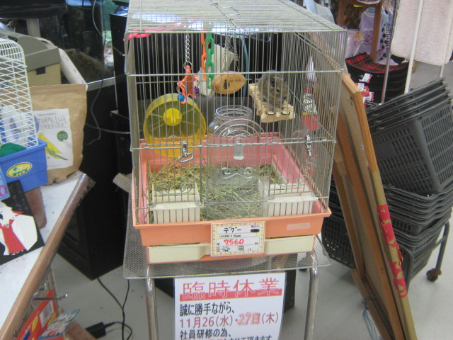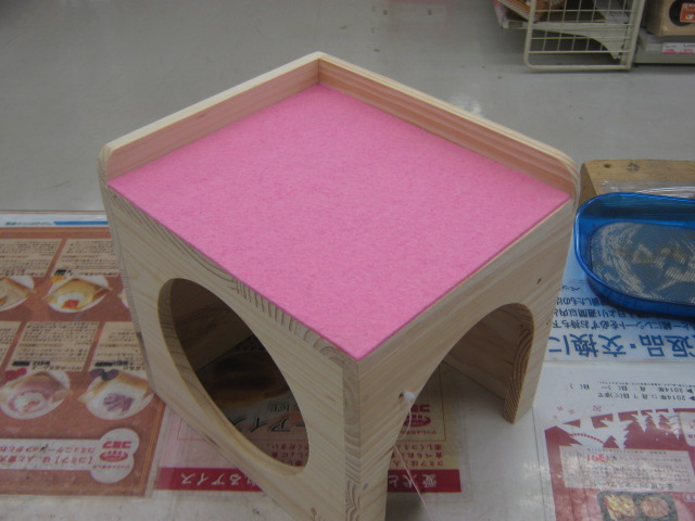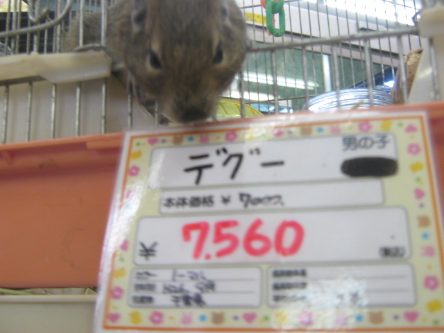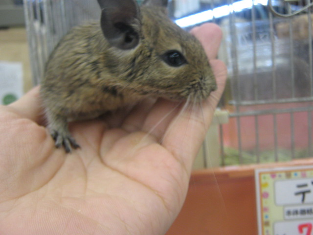 こんばんは! またもウサギで始めてみました、KYOさんです 今日はどんよりしていて嫌~な天気ですが、流山店ではオカメちゃんのお家が決まるという嬉しい出来事がありました よ~く可愛がってくれそうな明るいご家族でしたので、あの子も幸せになってくれることでしょう ありがとうございました 今日はオカメちゃんでしたが、先日はパイドのデグーちゃんが決まりましたね そのデグーちゃんが暮らしていたケージに新たな入居者が! 今度はノーマルの子です!! 今年の9月生まれの男の子 色は地味ですが、馴れ具合はバッチリです 手を差し出すと嬉しそうによってきますよ~(´∀`) 探検が大好き♪ 放すと自分で色んな所に行って遊びまわります そんなデグーちゃんのお値段はこちら ¥7560 こちらは現在のお値段ですが、これから成長度や馴れ具合によっては値上がりする場合があります 気になる方はぜひ流山店へ~ 遊びに来てくださるだけでも大歓迎ですよ 最近はいつもお店の子のことばかりですので、たまには商品紹介もしてみます とっても可愛い商品ですよ~ それがこちら! ただのサイコロハウスでしょ?どこが可愛いの? と思ったそこのあなた!ちょっと違うんですよ 実は上にピンクのフェルトが貼られているのです♪ フェルト生地は暖かいので、これからの季節にもピッタリ! ここにペットがちょこんと乗っていたら可愛いでしょうね~ ・・・・・・ ・・・・・・ うん、可愛い 他にも赤いフェルトのハムスターハウス(プチスロープ)や オレンジフェルトのコーナーハウスもございます コーナーハウスはこうしてケージに取り付けるモモンガやリスの足場ですよ この写真は通常版です 気になるお値段は サイコロハウス ¥2500 プチスロープ ¥630 コーナーハウス ¥980 ケージ内が華やかで楽しくなりますよ 最後にお知らせです 11/26~11/27の2日間、社員研修のため臨時休業とさせていただきます ご迷惑をおかけして申し訳ありません 11/28からは通常通り営業いたします それではまた次回~(・∀・)ノ