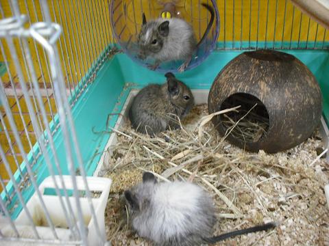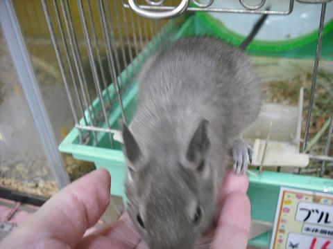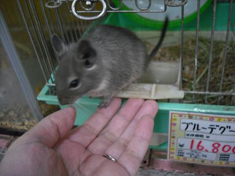 こんにちは、バイトのMです。 皆様、先日のお知らせはご覧頂けているでしょうか…? 本日は16時までの営業となっております。 お買い物をご予定の方はお早めに! ところで、新しいデグー達がやってきました。 ちびっこです。 仲良くルームシェアしてます(^▽^) パイド パイド ノーマルです。 パイドはペアで入ってます。多分、兄妹…きっとね。 ノーマルは男の子。 カメラが近寄っても大丈夫なくらいには、なれてます。 これから、もっとベタ馴れになる筈です! 馴らすのって難しそう… すでに馴れてるコが良いわ… という方には、 ブルーの男の子がオススメ。 このこは手を出すと、 自分から 乗ってきます。 腕までダッシュ! ブレブレですが可愛いです。 おやつをあげると、一口齧ります。 美味しいものは、ササッと持ち帰って床材の下に埋め(笑)、 何食わぬ顔でもう一つねだります。 おやつを隠す仕草も可愛いので、ぜひお迎えして見て頂きたい!(>v<) もう少し成長すれば、寒さには比較的強い動物ですので、飼いやすいと思います。 気になった方は、お早めに!!