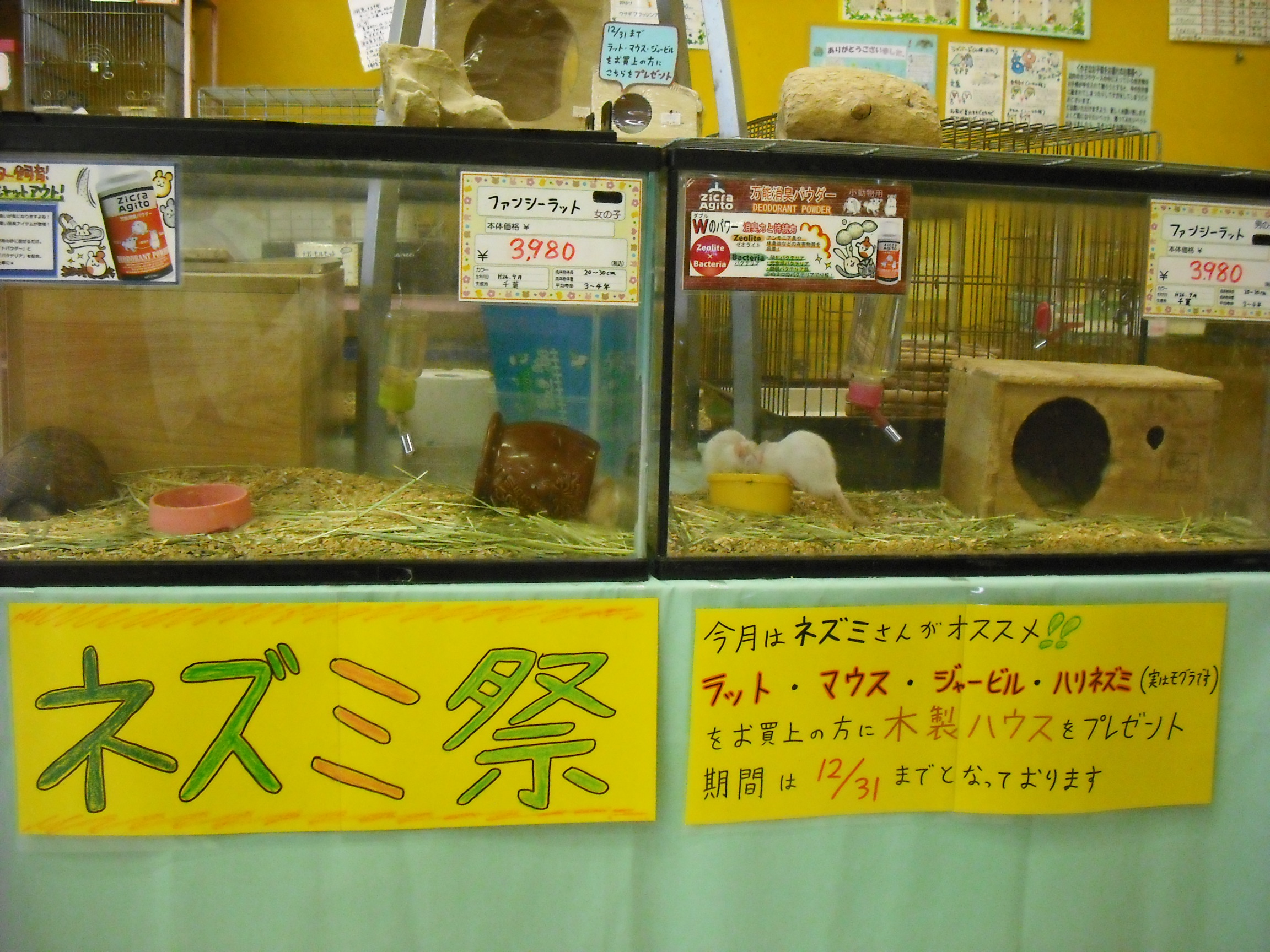 こんばんは、KYOさんです なんだか久々のブログ・・・、今日は12月のイベント紹介です(・∀・) タイトル通り、今月の流山店ではねずみ祭を行なっております!! 我ながら地味なPOP・・・ Mさんや松つあんのようなPOP職人になりたいです そんなどうでもいいことは置いておいて、これはねずみさんをお探しの方には嬉しいイベントとなっております 12/31まで、ラット・マウス・ジャービル・ハリネズミをお買い上げの方に木製ハウスをプレゼントしちゃいます!! ラット・マウス・ジャービルにはウェーブハウスS ¥648 ハリネズミにはサイコロハウス ¥2376 これらが付いてきます ハウスは飼い始めの環境になれていない子には必需品なので、これはとてもお得ですね 上にも書いてありますが、対象ねずみは以下の4種類となります↓ ファンシーラット 流山店でも大人気のねずみさん 頭が良いので、ものすごく馴れる子が多いですよ パンダマウス 流山店では久々の入荷! パンダ模様のとても小さいねずみさんです カラージャービル こちらもよく馴れるねずみさん 毛がふさふさでねずみっぽくはないかも? ハリネズミ 実はねずみではなくモグラに近い動物です 昼間は寝てることが多いですが、意外と馴れますよ♪ ねずみ系をお探しの方はぜひ流山店へ! お待ちしていま~す(・∀・)ノ