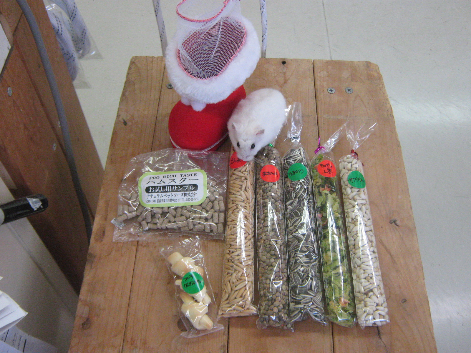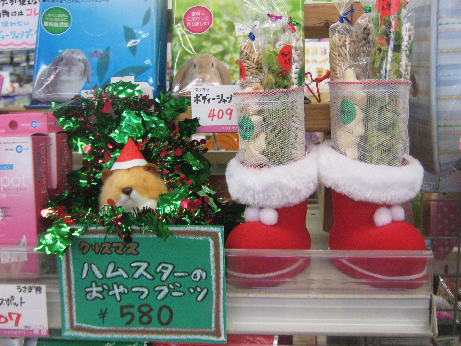 こんばんは!KYOさんです! こんな時間ですが、限定商品のご紹介です もうすぐクリスマスですね ワンちゃんやネコちゃんへのクリスマスプレゼントはすっかり一般的になったようですが、ハムちゃんにもクリスマスプレゼントをあげてみませんか? じゃんっ! 12月限定!! ハムスターのおやつブーツです!! 流山店では2個のみの入荷 気になる中身はというと・・・ こんなに詰まっています♪ えん麦、麻の実、ひまわり、サフラワー、乾燥野菜、プチクロワッサン、主食フード どれもハムちゃんが大好きなものですね これは喜んで食べてくれること間違いなし!! お値段は¥580となっております ハムちゃんも大切な家族の一員 一緒にクリスマスを楽しんでみませんか? それではまた次回~(・∀・)ノ