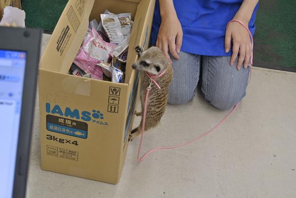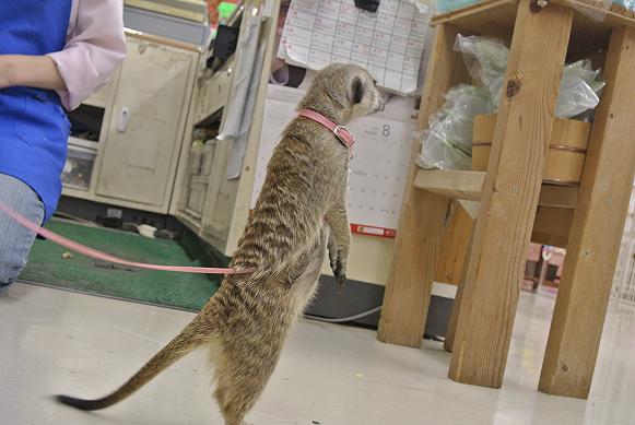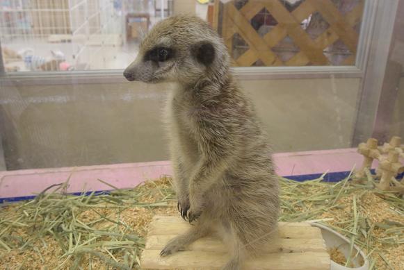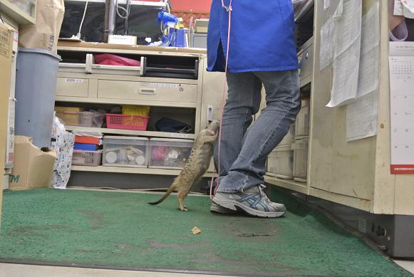 こんばんわ 店長です 以前にも少し書きましたが、当店いろんなコ達がお散歩していることがあります。 わんちゃんはモチロン! うさぎさんや、フェレット。 最近では「アヒル」がふつ~~うに店内を歩いていました。 なんか、異様な光景に感じましたが・・ 今日は・・・ !!! なにか「リード」が伸びてます~~ その先は・・・ はぁっ~~っっ 『ミーアキャット』 しかも!! 「かまって~・・ねぇ~かまってよぉ~~」って 言ってる がしかし!! 無視されてるしっ あっ!! あきらめた !!!! そして・・ブレるほどに『逃走』 逃げ切れないことを 察したらしく、たたずみに・・。 この姿でようやく「ミーアキャット」って分かりますねっ 小さいながらも、いっちょまえに立ちポーズを決め・・。 ホワホワの毛並みだった「ミーア」さん。 警戒心「0%」の うだる寝方の「ミーア」さん。 あどけなさが とってもステキでした・・・。 それが今や! よじ登り~いたずらし放題に 育ちあがりました そんなイタズラ坊主『ミーアキャット』 H25 2月生まれの 男の子です。 変わった生き物お探しの方、いかが でしょうか?? 明日はお休み たまには お部屋でゴロゴロでも してみよっかなぁ~~ 店長でした