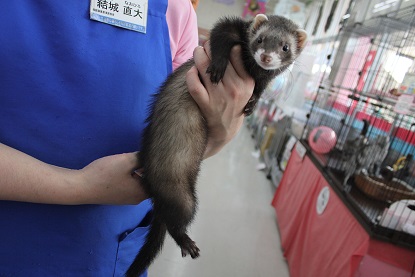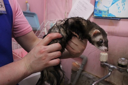 皆さん こんにちわ~ 暑くてKO寸前の結城です。 今日は フェレットのシャンプーをしました 写真はシャンプー前の写真です! では早速 レッツごしごし!! 濡れたフェレットもなかなか可愛いですね まぁ、よく暴れてくれました。 しかし!あるところを掴むと、この暴れん坊がとっても おとなしくなります。 あるところとは。。 店内のスタッフに聞いてください! で、苦戦することもなく出来上がり! シャンプー前とあんまり変ってないようですが 臭いがぜんぜん違います! いい匂いになってきっとフェレットも満足でしょう 以上!