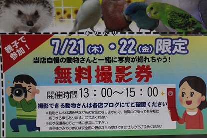 皆さん こんにちわ~ 今度の休みは初の八景島シーパラダイスに行く 結城です。 雨が降ったら行きません!! 7月16日~7月24日まで わっしょい夏祭りセールを実施します! この期間の21日と22日限定で 鳥・小動物の写真撮影会を実施いたします。 そこで今日はこの写真撮影会の時に一緒に写真が撮れる 動物をご紹介します。 では、どんどん参ります! プレーリードック ウサギ フェレット ハリネズミ 桜文鳥 ワキコガネ キンカチョウ(なれている子) セキセイインコ(なれている子) 達が一緒に撮影OKです! 写真を撮るにはチラシについている この券がないとできませんのでお気をつけ下さい。 *チラシは各店舗にて配布しております。 以上!!