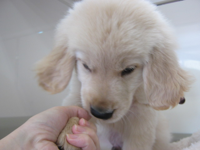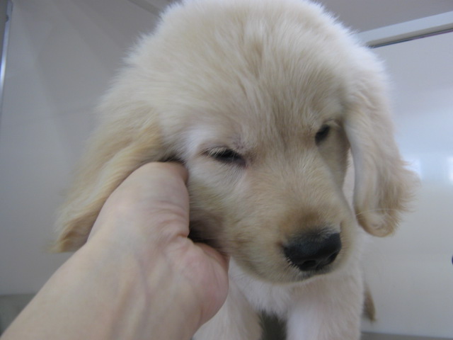 こんにちは、バイトのMです。 先日写真だけ載せた、 このコの紹介です! 恐らく、みなさんお気付きでしょう。 ゴールデンレトリバーくんです。 いつも、こんな感じで笑顔です。 笑うか、寝るか、食べるか…みたいな。 3月13日生まれの男の子。 おめめが小さめですかね。 かわいいお顔だと思います。 若干ゴールデンにしては…白い。 スタッフから『おこめ』と呼ばれて可愛がられています。 おての練習。 まだ2ヶ月、と侮るなかれ。 でかい。 私はそれなりに手が大きい方なんですが… ごーちゃんでかいぜ~。わいるどだぜ~。 性格は大型犬の鑑といえる、おっとりタイプ。 お水の食器をひっくり返して遊ぶのがたまにキズ。 大型犬をお探しの方! 今すぐに流山店へダッシュです! ごーちゃん、いつでも抱っこできますよー(^▽^)