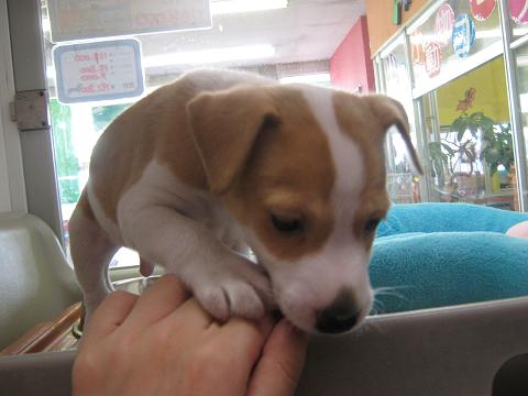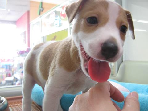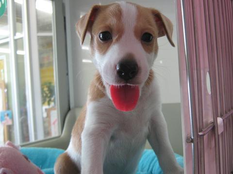 こんにちは、バイトのMです。 昨日のブログを読まれた方は、もうお分かりになるでしょう…… あのコの紹介です。 (※店長からバトンパスされていましたが、全力で放り投げ通常運行で参ります) (女子力?なにそれ?おいしいの?^▽^) じゃーん! 期待の新人!みんなのアイドル! ジャックラッセルテリアくんです! とても良い笑顔(∪・▽・) 5月29日生まれ。男の子です。 スムースなのでつるつる。 夏でも涼しそうです。 見ての通り、人見知りしません。イイコ! おしりも可愛いんです(*>v<*) 尻尾の長さも絶妙ですね(笑) そして、やっぱりこの笑顔。 是非一度、見に来て下さい! メロメロになりますよ(`・v・)b 以上、エアコンが壊れて蒸し暑い流山店よりお送りしました。 パソコンが熱くなってて、こっちも壊れそうでドキドキです。 では。(^▽^)ノシ