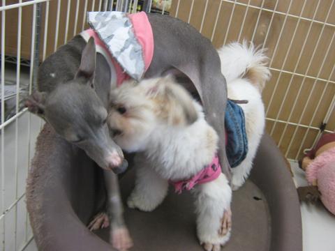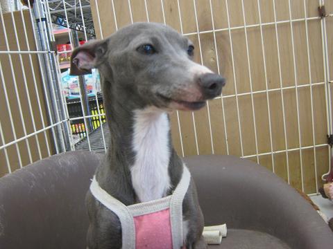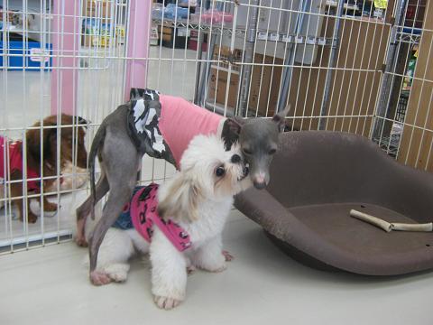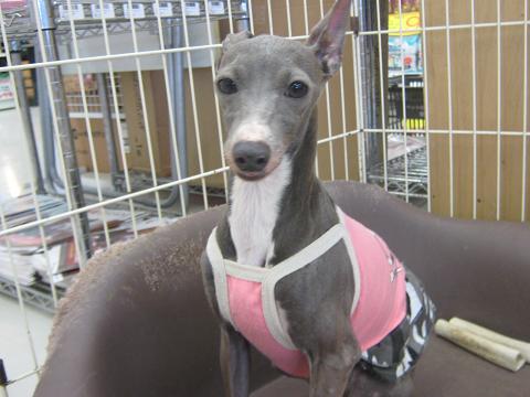 こんにちは今日もう3月だと思っていた松っあんです笑よりによって2月は少ないのに・・・とんだ勘違いでも暖かいですねーこの調子で春来ちゃえばいいのにさて、本日は最近サークルに仲間入りしたわんちゃんの紹介イタタグレの女の子仮名「よもぎ」でございます。実は2歳のちょっと大人女子。(H22.9.8生)いっしょにいるシーズーにちょっかい出されても・・・大人な対応。どんなにじゃれあってスカートをめくられても・・・「だってお姉さんだもん」と言ったようなこの表情。さすがですね常に落ち着いていて無駄吠えもしません。ただサークルを走り回っている姿はとても楽しそうです気になるお値段は・・・¥50000なり最後におまけ本日サークルデビューします。ゴールデンの男の子。仮名「プラダ」くん早速リードをつけて初店内散歩とっても元気いっぱいで写真撮るのに苦労しました上の写真は主任の懇親の1枚使わせていただきましたコチラは松っあんの苦労の1枚どちらの写真も共通して言えることは「カキ氷」がよくお似合いですねちょくちょくレジ番してると思うのでみなさんよろしければ遊んでやってください