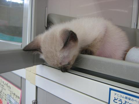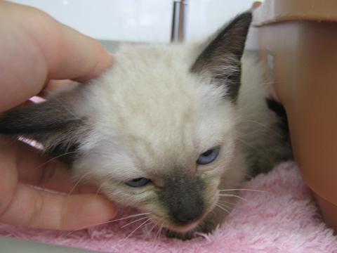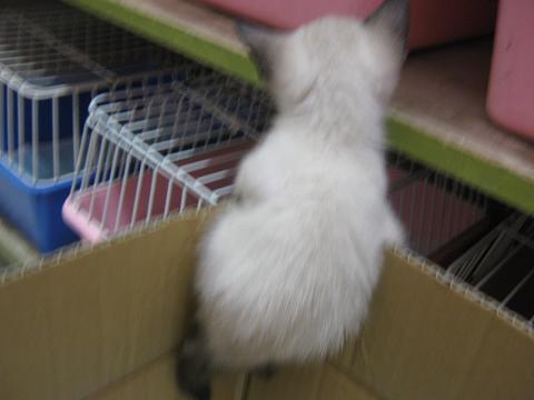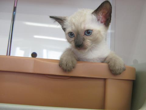 こんにちは松っあんです 最近ブログの更新をサボりっぱなしだったのでちょっとプレッシャーです でも今日来た新入りちゃんはハンパなく可愛いですよぉ では早速 ダンボールにミャーミャーと可愛らしい鳴き声・・・ ちょっとのぞいて見ると・・・ いました~可愛いコ 自分的にお気に入りの1枚です 大きい水色のお目目・・・ 何のネコさんかわかりますでしょうか? 正解は 久しぶりのシャム猫さん。男の子です(H25.4.19生) ご覧の通りまだビビリさんです。 威嚇してる顔に見えますが実際はミャーミャー鳴いてるんです。 でもなかなかのイケメン君じゃないですか? 少し慣れてきたのか脱走を試みるも・・・ すぐに犬舎デビュー固まってます。 犬舎にも次第に馴れてきてちょっと下の住居犬の様子を伺ったり・・・ ちなみに下には 「ん?」という表情のぺーやん。大きくなりました 他にもシャムさん、 トイレから「こんにちは」してみたり・・・ 自分と同じくらいの大きさのおもちゃにびっくりしたり・・・ ミャーミャー大きく鳴く声に 下のペーやんも興味深々 そんな気になるシャム様のお値段・・・¥128000なり。 ちょっと馴れてきたかな? 最終的になでなでが大好きみたいです シャムさんの入舎は少ないのでお探しの方、気になる方はお早めに ちなみに店長、明日は例の「茨城」に行くみたいですね~。 ある水族館に行くみたいですが実はそこ、 専門生時代に松っあんが1ヶ月研修しに行ったとこなんです その水族館の近くにあるレストランの「カニピラフ」が美味しいんですよねぇ~なんて 明日、晴れるといいですね