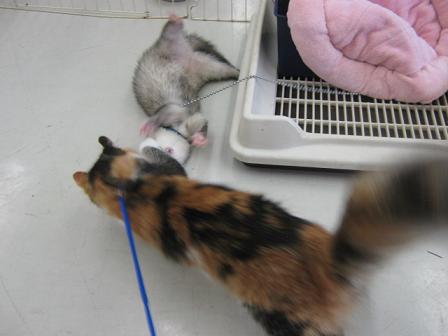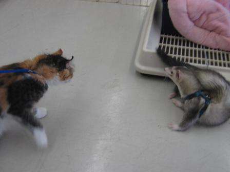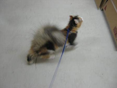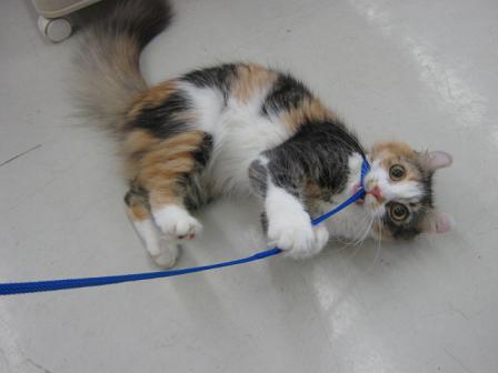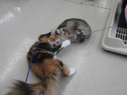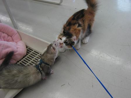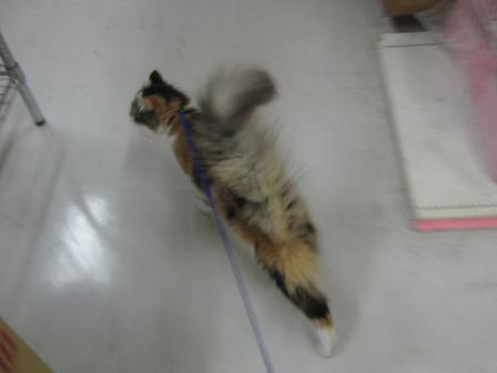 こんにちは松っあんです 誰か私に時間をクダサイ。 やらなきゃいけない事がたくさんあるのに時間が足りない! 部屋の掃除に、夕飯の買い物・・・家計簿もサボりっぱなし なのに最近マンガや小説ばっかり読んじゃって。。。 あと2日後に1歳年が増える干物女です さて、題名にも書きましたが今日は流山店の干物ネコ代表ではなく 以前何度かブログに登場しているこのコ。 アメリカンカールの女の子”キャリーさん”が主人公。 最近お腹がタポタポしてきているので店内散歩を始めました! なので今日はその模様をお届けします。 リードも嫌がらずに付けさせてくれる女王様。 まずは準備体操がてらにリードでじゃれます。 気が済んだところで お散歩開始。 いきなりの猛ダッシュなのでブレてますが気になさらずに。 とっとっとーっと軽く小走りしながら周りをキョロキョロ。 興味があるとしばらく動きません。 そんなきゃりーさん。 お気に入りの場所を見つけたみたいです。 小さい窓から外をよく眺めてます。 車が気になるみたいですね。 一通り店内を歩き終えたら最後は必ずレジの方へ行きます。 いたずらコラーッ そんなこんなで寝床に帰ろうと思ったら おさわり担当フェレッツに遭遇! キャリーさん早くも戦闘態勢! あ~やっぱりこーなるよねぇ~ 激しく争ってるように見えますが 2匹とも噛んだりしませんし、ツメも出さないので 出血大サービスにはならないのでご安心を そして最後は ニャかニャおりのチュー ちなみに撮影にご協力いただきましたこちらのフェレットさん。 入り口入ってすぐのところにおさわりフェレット代表として選抜されました。 たまーに甘噛みしますがとっても性格が穏やかなので 小さいお子さんが触っても大丈夫です 遊んだりなでなでしてもらうのが好きなコなのでぜひ遊んであげてください では雨が降りそうなので帰ります さよーならー