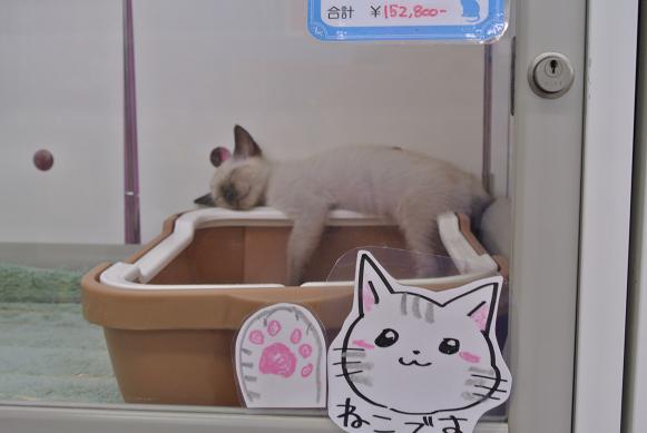 こんにちわっ 店長です 昨日ですがお客様より「店長は禁煙して何日になるの??」というご質問があり 「もうじき2ヶ月なんですよ~」なんてお答えしたのです。 そうしましたら、なんと!!「私も店長のブログ見て『禁煙』始めたんです」って!! おぉぉ・・!!嬉しい一言でしたねぇ~~ ブログを見ていただけていること!しかも 個人的なことがお役に立てていたことっ!! 始めて間もないそうですので、辛さがとっても良く分かりますっ!! 「T様」!いっしょにがんばりましょうねっ では本題に移りますよー といっても・・今回は ほぼワタクシの「ツボ」写真満載です 以前ご紹介がありました 『シャム』さま 予防接種も1回目が無事終わり・・お店にも 馴染みきったようで・・ 「爆睡」でございますっっっ あっ!! 手前のイラストはですねぇ~ お客様より 「ネコいないのぉ??」っていう ご質問が多かったので これぐらいアピールすれば 分かるでしょうということで 「ねこです」POPを Mさんに書いてもらいました いいなぁ~~・・ 気持ち良さそうで 見てっこのダル足 なかなかの「爆睡」っぷりでしょっ そしてーーー この 「寝顔」 もう・・ステキですぎます 言ってしまうとこれで「シャム」さまの写真は 終了。 そうです!起きているまともな顔の写真は ゴザイマセン なので 実物を見に来て下さい そんな 眠り王子「シャム」さま! H25 4月19日生まれ イケメン男子 です! お値段は ・・・・前回のご紹介記事をお読みくださいませ~~ そういえば、最近流山店では「お散歩」がブームに わんちゃんはもちろん!アヒルやら~ うさぎさんやら~(脱走にちかいですがねx) フェレットやら。 今日見かけたのは・・・なんとなんと!!! 『ミーアキャット』 名前は「ノブナガ」 仮) です お散歩担当は Mさん。 なんとも 不思議な光景ですなっ タイミング良ければ見られるかもッ 店長でした