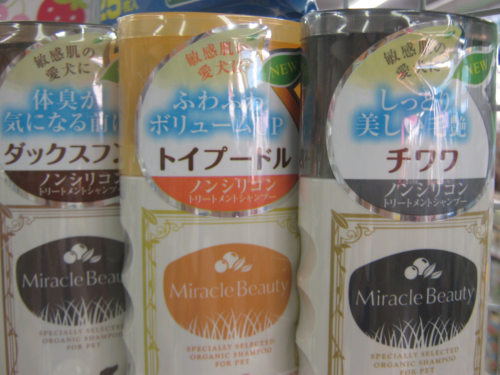 こんにちは、バイトのMです。 もう少しで待ちに待ったゲームの発売日なので少々浮かれております。 予約はバッチリなので家に届くのを待つばかり… まあ、そんな事はどうでも良いので本題に移りましょう。 犬用おやつコーナーの辺りに、(松っちゃんが)こんな棚を作ってくれました。 わんちゃんのお手入れに欠かせないアイテムが揃っています。 最近はフードだけでなく、シャンプーも犬種別だったりしますね。 三つとも、ノンシリコンで肌に優しい! これは、飼い主さんとおそろいで使えちゃうコロンです。 人ごみにわんちゃんを連れて行く時などは、ニオイにも気を遣ってあげたいですね。 一緒に初詣へ出かける方も多いのではないでしょうか? わんちゃんが苦手な方から見ても、『あのコ、可愛いね』って言われる方が飼い主さんは格好良いのです。 リボンも色んなカラーをご用意してあります! お家で結ぶのはちょっと難しいかも知れませんが、これだけで印象がガラッと変わりますよ♪ 最後に、トリミングスプレー。 最近わんちゃん、ねこちゃんに触ろうとすると、静電気が… そんな時にも役立つのが、トリミングスプレーです。 シュっとしてブラッシングしてあげれば、静電気も抑えてくれます。 この時、プラスチックのブラシは使わない方が良いようです。 (余計静電気がおきやすくなると聞いた事が…) 金属のブラシで優しく梳かしてあげましょう。 わんちゃんのシャンプーは月に一回が目安。 でも、お散歩に行ったりすれば当然汚れてしまいますよね。 次のシャンプーまでの間、スプレーやウェットティッシュなどで整えてあげれば、毛玉も出来にくいしシャンプーもしやすくなります。 ちょっと説明も面倒臭くなって来たのd(( 見てるほうも飽きたと思われるので、新入りねこちゃんの紹介タイム! ノルウェージャンフォレストキャット!! 小さい!可愛い! 何よりも、この色合い…素敵…! ミルクティーが飲みたくなる色です…はー、可愛い(*´・ω・*) 9月23日生まれの男の子です。 ため息の出ちゃう可愛さ。 とりあえず見に来てみて下さい。 惚れます。