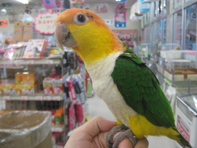 こんばんは、KYOさんです! 本日2度目の更新。 勝田台店からやって来たシロハラインコさんです! 去年の12月生まれの元気っ子♪ 性別はまだ不明です 遊び好きで色んな物に興味を示し、自分で色々な遊び方を考える鳥さんです。 人にもと~ってもよく馴れてくれますよ! 環境に馴れてくると、ゴロゴロ転がったり走り回ったり、とても鳥とは思えない遊び方をするようになります(* ・ v ・ *) そんなシロハラインコさん お値段は目玉が飛び出るほどのものですが、「ブログ見たよ」と言ってくださった方には10%OFFとさせていただきます!! こちらのシロハラインコさんは、来月には勝田台店に帰ってしまいます! ですから、この企画も9/30までとなっております。 お家に迎えようとご検討されている方は、この機会にどうでしょうか? さて、もう1つご紹介するのは小鳥のおもちゃです! 最近サンコーさんから発売されたバードトイバルーン ¥480 カゴにぶらさげて使う小さいおもちゃで、小鳥が楽しみやすいようにカラフルになっています。 鳥さんは無色よりも様々な色が付いたものに興味を示しやすいそうです。 カゴに付けるとこんな感じ↓ 小さいので小型のカゴにも使いやすいですね♪ カラフルなので、大型カゴのアクセントにもいかがでしょうか? ・・・・・・・ そうやって使うものではありません それではまた次回(・∀・)ノ