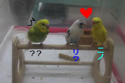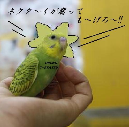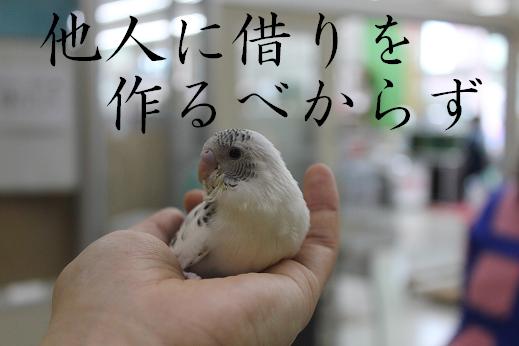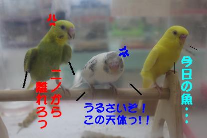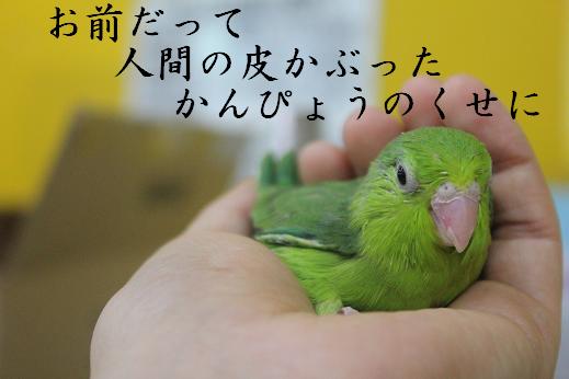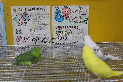 こんにちは、天誅です。 最近、着実にガンヲタニュー〇イプとして覚醒しつつある松ナブル大佐が馴らしている バードさんたちのお家がどんどん決まっているので、 私もマネをしてバードさんを馴らそうと思った次第であります。 ということで、寸劇。 元ネタ、分かる方だけ、クスリとして頂けると幸いdeath o.....rz 本日の出演。 「セキセイインコ」 “内定とれ太”こと “リクルート” 「セキセイインコ」 “2-3”こと “ニノ” 「マメルリハ」 “ムラナガくん”こと“村長” の3羽でした これからこのコたちを馴らしていきますので、 店頭で肩に小鳥を乗せている怪しい中年男性を見かけても やさしい目で見守ってやってください。。。 それでは、さようなら