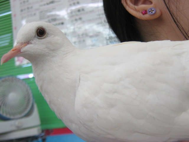 こんにちは、バイトのMです。 毎度ラットやら メキシコインコやら アオジタトカゲやら を肩乗せしている私ですが、本日はこちら。 ギンバトさんです。 何のひねりもなく、『銀ちゃん(仮)』と呼んでいます。 見慣れない気がしますが、マジックショーで帽子の中から飛び出してくる“あの鳥”がギンバトです。 もともと穏やかな性格。 大人になってからお店に来たので、ちょっと人見知りするのですが、 乗せてみれば意外と大人しい。。。 これから手品師を目指すあなたも、そうでないアナタも、いかがでしょう? お値段¥10800。 鳩なので、セキセイやオカメさんとは食べているご飯が違います。 お世話で分からない事は、何でも聞いてください。 あ、マジックのタネと仕掛けは聞かれても分からないのであしからず。 拍手返信! 舘 喜世子さま アヒルさん可愛いですよ~(^▽^) お尻プリプリしながら歩く姿がたまらないですよね! 今お迎え頂けば、黄色から白い羽に変わる様子がお家でじっくり見れちゃいます!(笑) おうちの仲間入り、是非ご検討ください(^v^*)