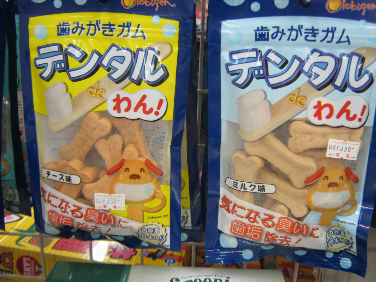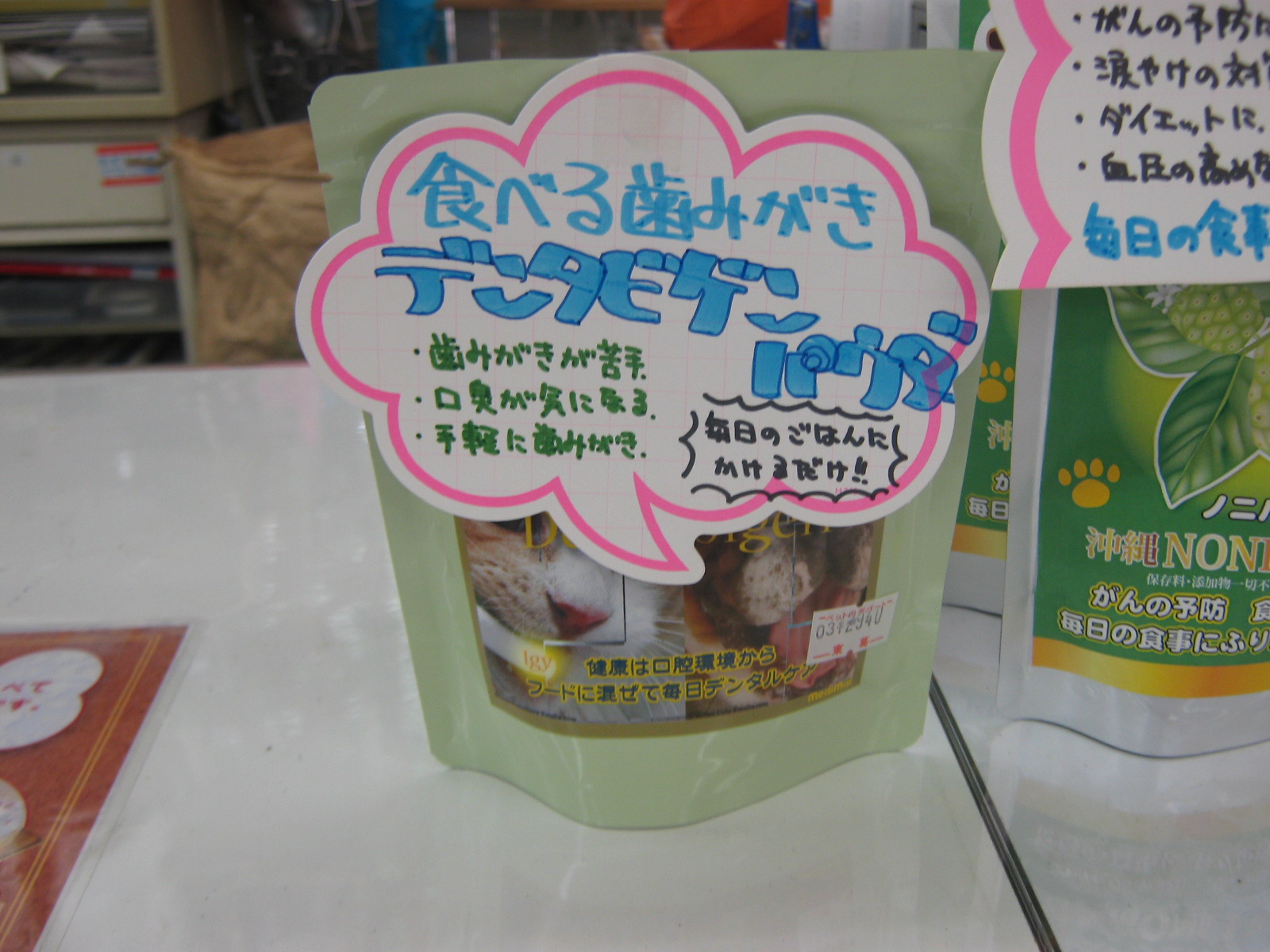 皆さんこんばんは、店長のYです本日は、わんちゃんを飼っている方なら誰しもが1度は考える「歯みがき」のアイテムのご紹介です。まずは、とっても良い子のアイテムですコチラはわんちゃん・ねこちゃんの歯ブラシです。コロコロと転がるのでこすらなくても良く、嫌がりにくくなってます。さらに、とても細かい毛なので汚れも落ちやすいです口の中を触っても大丈夫な子はコチラはいかがでしょうか?子犬・仔猫ちゃんの場合は、歯ブラシを少しずつ口にあてて慣らしていきましょうね続きまして、口を触るのはちょっと出来ない方はコチラです。歯みがきガムの「デンタルdeわん」です。口の臭いが気になった時や口の中の健康維持、歯の弱ってきたわんちゃんにも食べやすい固さの、歯が食い込むガムですただ、ガムは噛んだ所しか歯みがき出来ません簡単に歯みがき~~となるとコチラですいわゆる「歯みがきパウダー」ですコチラをいつものフードにサラサラっとかけるだけで、歯みがき効果があるそうです。いつも食べてるガムなどにかけても効果があるそうです。口まわりを触れない・手軽に歯みがきしたいという方は1度お試し下さいねコチラは1回ティースプーン1杯で、1日1~3杯あげて頂けると良いそうです。約1ヶ月位分でお値段2940円となっております。ちょっと高価な歯みがきですが、効果は期待できるかもしれませんよとりあえず1ヶ月、続けて見て下さいねそれでは、また~~