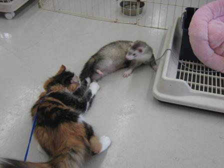こんにちは松っあんです 誰か私に時間をクダサイ。 やらなきゃいけない事がたくさんあるのに時間が足りない! 部屋の掃除に、夕飯の買い物・・・家計簿もサボりっぱなし なのに最近マンガや小説ばっかり読んじゃって。。。 あと2日後に1歳年が増える干物女です さて、題名にも書きましたが今日は流山店の干物ネコ代表ではなく 以前何度かブログに登場しているこのコ。 アメリカンカールの女の子”キャリーさん”が主人公。 最近お腹がタポタポしてきているので店内散歩を始めました! なので今日はその模様をお届けします。 リードも嫌がらずに付けさせてくれる女王様。 まずは準備体操がてらにリードでじゃれます。 気が済んだところで お散歩開始。 いきなりの猛ダッシュなのでブレてますが気になさらずに。 とっとっとーっと軽く小走りしながら周りをキョロキョロ。 興味があるとしばらく動きません。 そんなきゃりーさん。 お気に入りの場所を見つけたみたいです。 小さい窓から外をよく眺めてます。 車が気になるみたいですね。 一通り店内を歩き終えたら最後は必ずレジの方へ行きます。 いたずらコラーッ そんなこんなで寝床に帰ろうと思ったら おさわり担当フェレッツに遭遇! キャリーさん早くも戦闘態勢! あ~やっぱりこーなるよねぇ~ 激しく争ってるように見えますが 2匹とも噛んだりしませんし、ツメも出さないので 出血大サービスにはならないのでご安心を そして最後は ニャかニャおりのチュー ちなみに撮影にご協力いただきましたこちらのフェレットさん。 入り口入ってすぐのところにおさわりフェレット代表として選抜されました。 たまーに甘噛みしますがとっても性格が穏やかなので 小さいお子さんが触っても大丈夫です 遊んだりなでなでしてもらうのが好きなコなのでぜひ遊んであげてください では雨が降りそうなので帰ります さよーならー