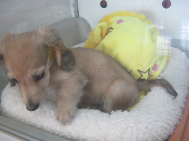 こんにちは、バイトのMです。 松っぁんから投げ付けられた、もとい、手渡されたバトンを持って新入りわんちゃんの紹介です。 ライオンのぬいぐるみと一緒に犬舎デビューを果たした、ミニチュアダックスの女の子。 4月25日生まれで、まだまだ幼い顔つきです。 シェーテッドクリームという、ちょっぴり珍しいカラーです。 濃い茶色と、淡い茶色がとてもキレイ。 お尻の方にもちょっと濃い茶が… 人懐こい性格で、誰とでも仲良くなっちゃいます♪ ちょっと撫でてあげると、すぐにお腹を出しちゃうダッちゃん。 こんなポーズされたら離れられなくなりますね。。。 外は暑いですが、可愛い子が沢山待ってます! 鳥のフード詰め放題も、楽しんで詰めて帰られる方が増えてますよー! 鳥だけでなく、ハムスター・ラット・デグー・シマリスのおやつにも良いかも知れません★(>vの)b これからの時間帯、少し涼しくなればお外にも出易くなりますね。 お店は8時まで開いております。 是非、ご来店ください。