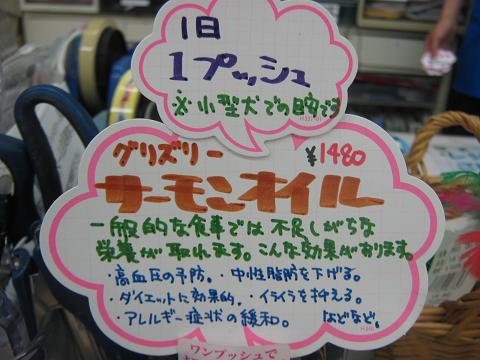 こんにちは、バイトのMです。 今回の店長指令は「何か書いて」だったので、なにか…書きます`・-・φ 色々悩んで商品の紹介にしようと思います。 暑かったり涼しかったりする日が続きますが、おうちのコはバテていませんか? 夏バテはペットの大敵です。 食欲が落ちてきたら要注意ですよ! 夏バテ以外でも、『うちのコ好き嫌いが多くて』とか、『最近ちょっと毛ヅヤが悪くなった』とか、『おやつばっかりで太ってきた』とか。。。 そんな悩みを全部解決できちゃう素敵な商品がコチラ。 ご存知の方も居るでしょう。サーモンオイルです。 鮭です。 もちろん、とても美味しいもの。 こんなに色んな効果があって、美味しいから長く続く!すてき! でも、美味しいって言われてもパッケージだけじゃ良く分かりませんね。 なので、 柏店に倣い、瓶に入れてみました。 フタのPOPはM特製。 レジ前に置いてあるのでお会計の時にちょこっとニオイを嗅いでみてください。 多分、想像してるよりもイクラの香りに近いです。 醤油と一緒にご飯にかけたら美味しそうなにおいがします(`・H・)お腹空いた…… コチラのサーモンオイル、 わんちゃんにも、 ねこちゃんにも使える優れもの。 是非、一度お試し下さい。