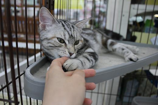 こんにちは松っあんです 今日はポカポカ良いお天気ですねぇ 早く帰って洗濯して松潤の弁護士ドラマの続きが見たーい!笑 はい。 今日は二和店からお借りしてそのまま頂くことになりました、 誰もが絶賛する美人。。。いや美猫さんのご紹介 まずはお決まりの・・・ カメラが気になるぅぅぅ~ か~ら~の~ かわいいポーズ か~ら~の~ 美猫さんみーっけ アメリカンショートヘアの女の子。(H27.12.24生まれ) よーく見ると目のアイラインが茶色のとってもおしゃれさん! 顔周りも美白なのでもう言うことなしですね 月齢にしては小柄な方だと思います。 ・・・が毎日毎食よく食べるご飯大好き女子。 ものの数分でペロリと完食してしまいます。笑 写真じゃわかりにくいですが シルバーパッチドタビーなので 背中やお腹周りに茶ポチがポツポツついています。 そして活発! 3段ゲージの枠部分を起用に使って上り下りする、 男子に負けないたくましさ! (たまに派手に落下しますが。。。) そんな活発な部分もありますがそれを上回るほどの甘えんぼさん まだ甘噛みしますが全然痛くありません! むしろ ザラザラ舐めてくれます。 そんなあまあまな美猫アメさん。 いつでもおさわり自由ですよぉ~ 変なポーズ!笑